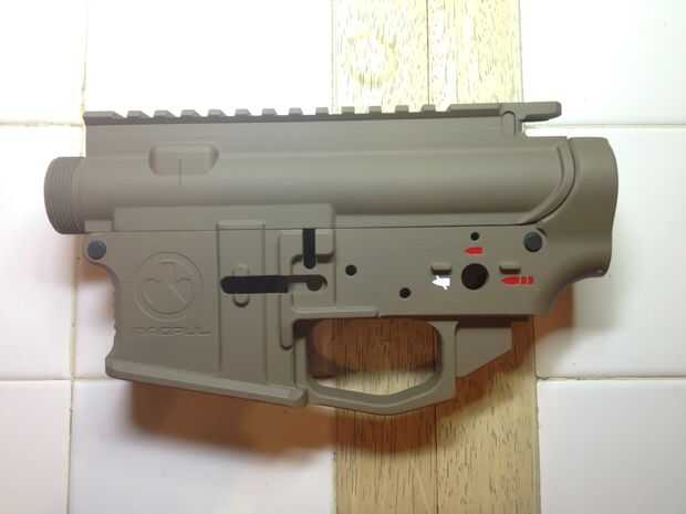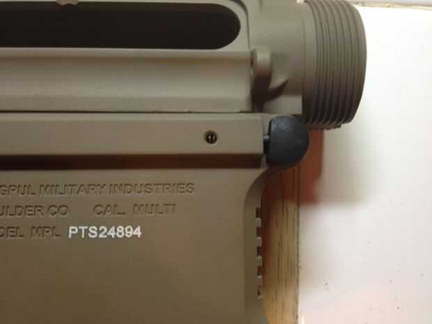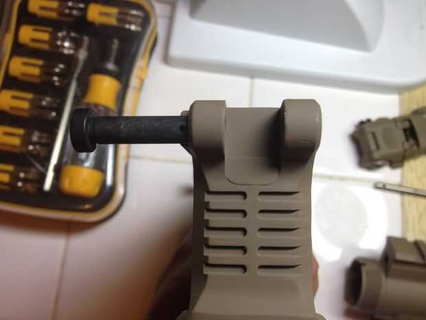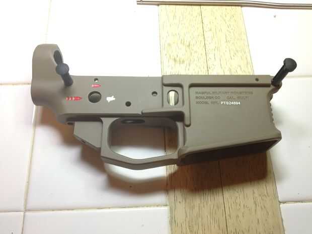 Coloque el receptor para que el perno del cuerpo sobresale de la mesa. Coloque la herramienta de golpe en la parte plana del perno del cuerpo (en el lado del receptor con el símbolo de Magpul) y golpee con el mazo/martillo hasta que el pasador de cuerpo ha resbalado casi fuera el receptor. Repita para el otro pasador.