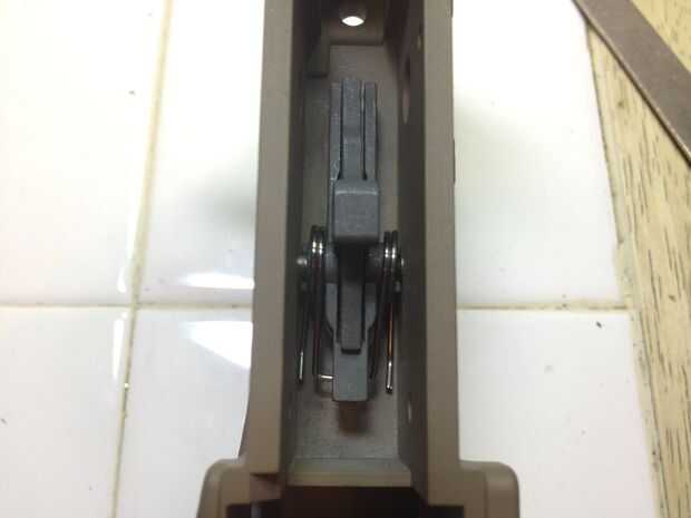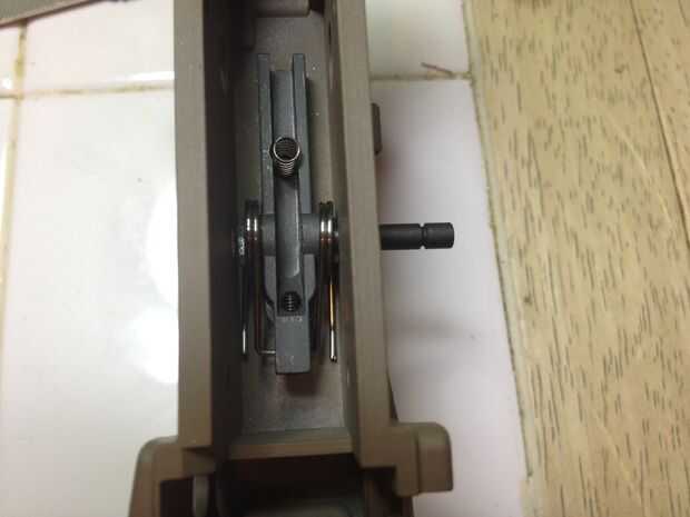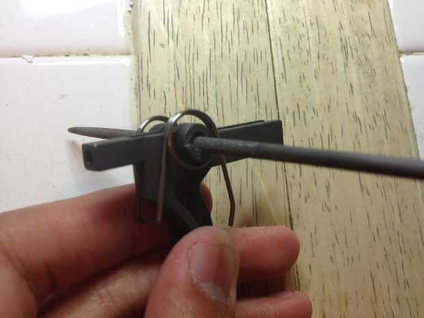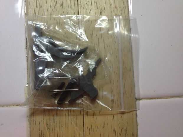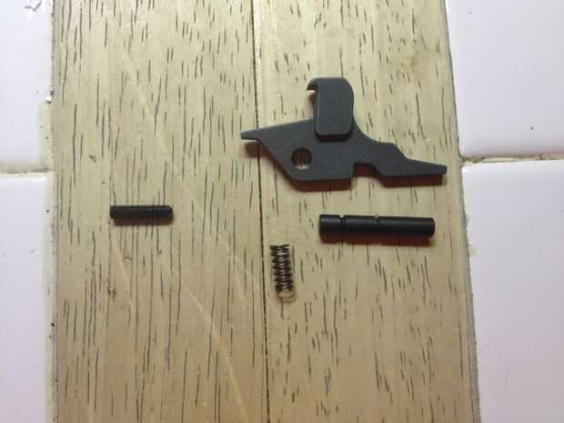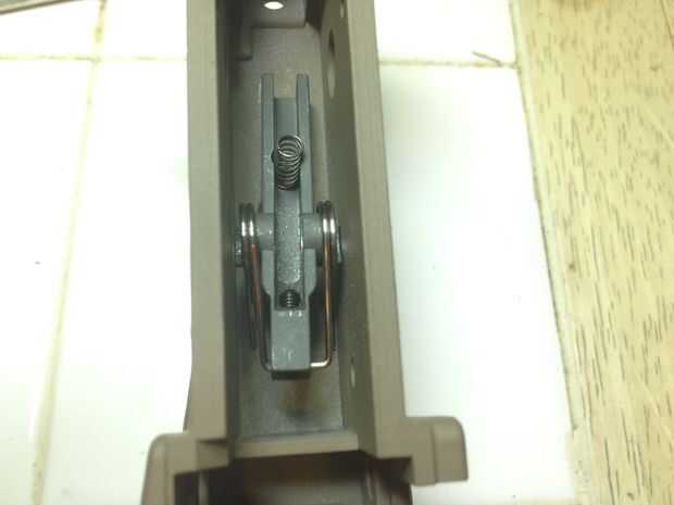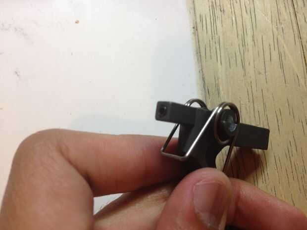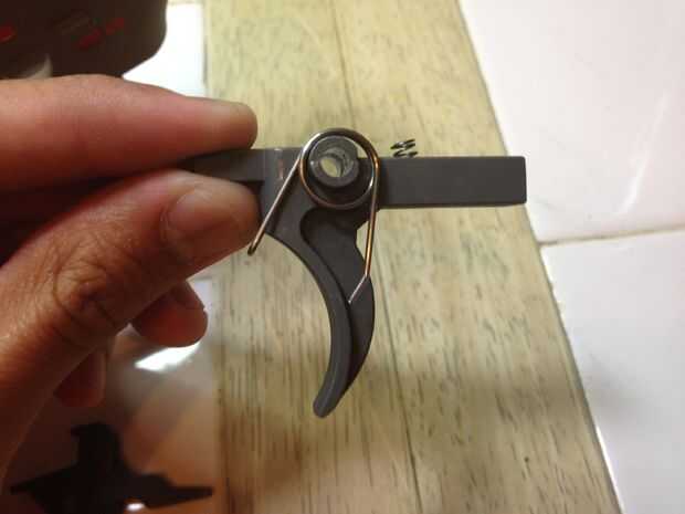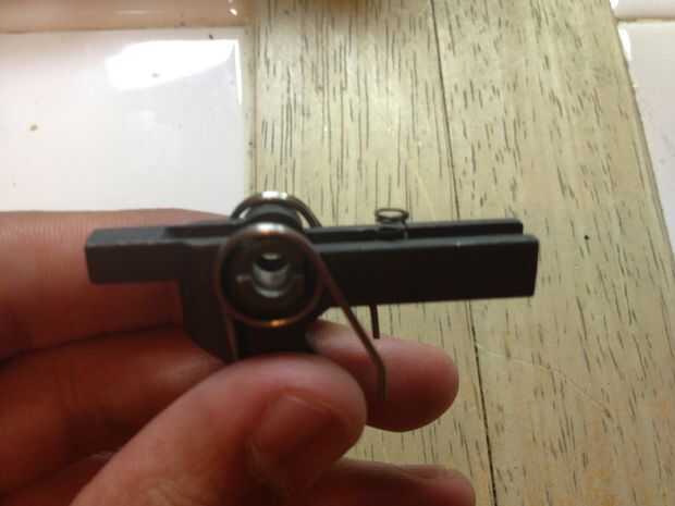 A continuación, poner el tornillo en la parte delantera del gatillo como se muestra. Luego, coloque el resorte pequeño en la muesca en el gatillo (si usted lo mira desde la parte superior, hay un corte circular hacia fuera que el resorte se encuentra en). La otra pieza de metal en la ranura, asegurándose que los orificios se alineen y el corte se coloca sobre el resorte como se muestra.