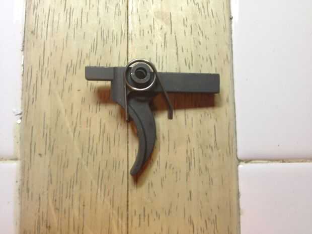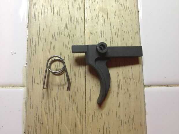 Colocar el gatillo en el recibidor inferior, asegurándose de que el resorte grande permanece contra la parte delantera del gatillo como se muestra. Puede ser más fácil dejar de lado la pieza de metal plana en primera. Poner la clavija en la parte que haya presentado, pero sólo lo suficiente para deslizar a través de la mitad del disparador. Presione la pieza de metal en el resto del conjunto disparador, luego deslice el pasador. Deberá aprovechar en el perno para que sea completamente insertado.
