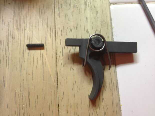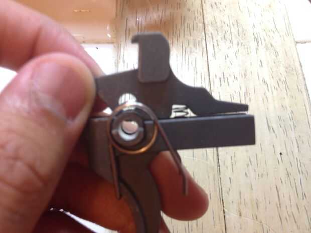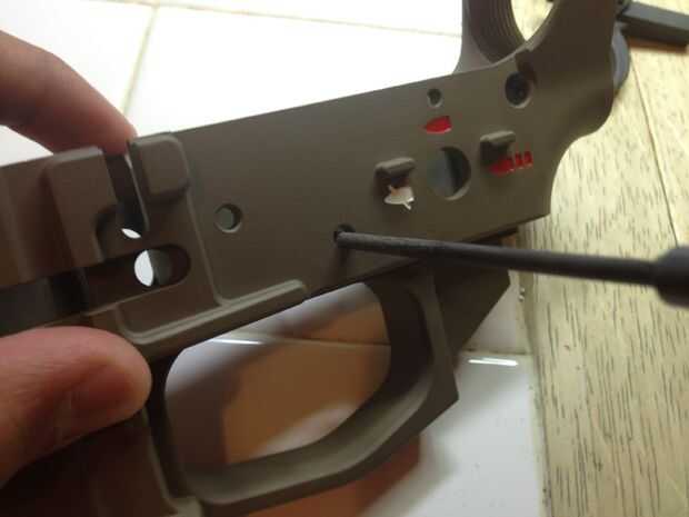 Antes de insertar el gatillo en el receptor, prueba de lo difícil que es encajar el perno en el conjunto del gatillo. Si es necesario, use una lima redonda en el interior del gatillo. Presentar uno de los agujeros del receptor como se muestra, se trata de que usted inserte el pasador a través. El otro agujero en el receptor debe permanecer no archivado para que el pin permanece en su lugar cuando está completamente montado.