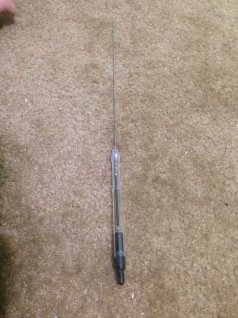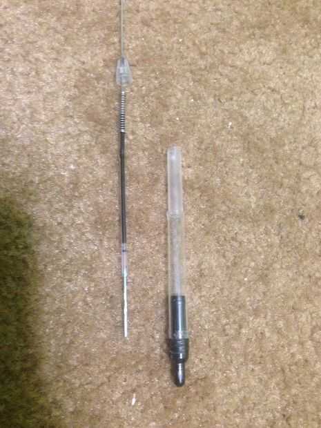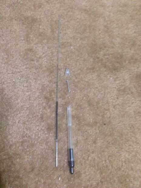 Una cosa que quería añadir el e-brake era un botón de "liberación". Realmente no suelte nada pero en cambio, simula la acción de tener que pulsar el botón para liberar el mecanismo de trinquete en automotrices frenos de mano. Esto era más de la preferencia personal tengo podía fácilmente a utilizar el interruptor principal por sí mismo y sólo levantó el freno e y eso sería todo. Quería obligarme a conseguir en el hábito de tener el botón de disparo cuando se utiliza el freno e para todo, pero se pretende objetivo. (Es decir, a la deriva, poder deslizante, j vueltas). Para hacer esto he querido añadir otro botón en serie con el botón principal para que tengan para completar el circuito de ambos interruptores hacer contacto eléctrico al mismo tiempo para completar el circuito. Esto me llevó a mi próximo obstáculo. Necesitaba alguna forma de hacer un resorte botón que había sobre una media pulgada de recorrido. Para ello he usado y viejo. Tomé la pluma, sacando la punta de bola e inserta un rotor de cola extra link de impulsión en el tubo de tinta. Entonces quité el mecanismo de la pluma y con el fin de mantener la misma longitud interna de la pluma que necesitaba presionar un clavo en el extremo de la ley del tubo de tinta. Luego armar nuevamente la pluma y tenía un improvisado "botón". La cosa agradable sobre la pluma haber elegido lo que el diámetro exterior de la pluma era apenas lo bastante pequeño como para una presión dentro del eje de cola