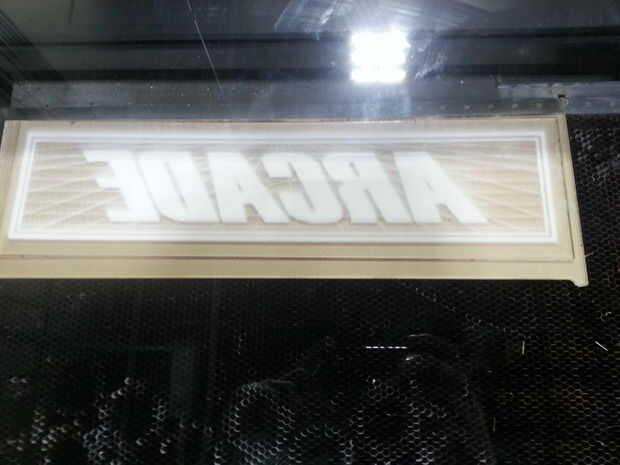 Uso de láser de FirstBuild grabar 1/4 de pulgada de acrílico con logotipo de "ARCADE" o cualquier otro diseño que desea utilizar para su gabinete. Es muy importante que grabe la imagen en la parte posterior del acrílico para que cuando borde luz con LEDs que no conseguir sombra y la luz se filtra algo al pasar por el acrílico en la parte delantera visible. Aviso de la imagen cómo la imagen está al revés y está grabado en la parte posterior del material y la parte delantera visible es hacia abajo.