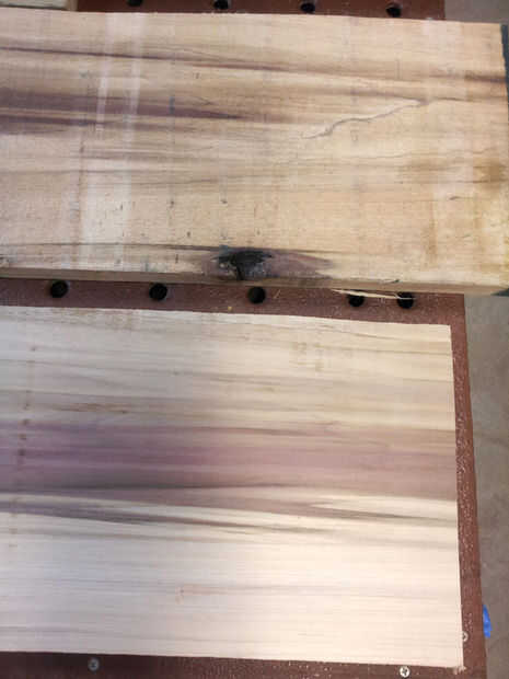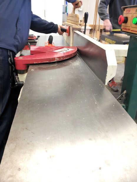 Primero fueron en la ensambladora algunas veces para crear una cara plana, luego a través de la pintura con la parte plana hacia abajo. Surfacer (cepillo) se quita 1/32" de espesor por paso, hasta logra el espesor deseado.