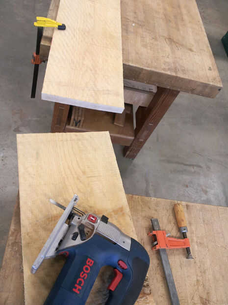 Aquí está mi hermoso pino de Torrey y álamo, que se suma a unos 15 pies. Después de algunos planificación y montaje de todos los elementos del armario sobre estas placas, se cortaron con una sierra de calar en trozos más pequeños.