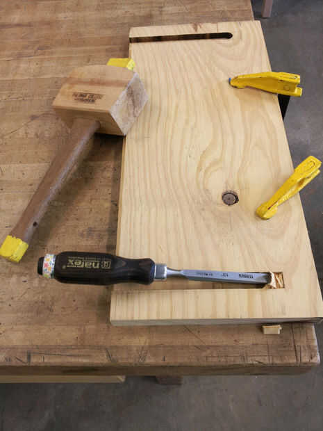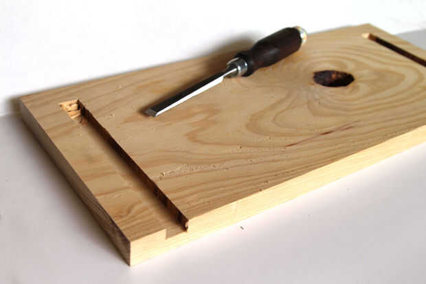Las piezas superior e inferior fueron cortadas a la medida en la Sierra de mesa primero. Los desniveles y las articulaciones dado ciego se cortan con un router. Puesto que el router corta en un movimiento circular, al final de las juntas de ranura ciega cortaron cuadrado con un cincel de 1/2".