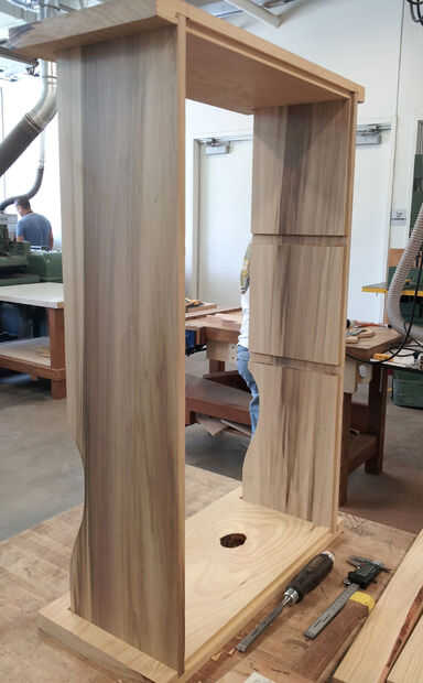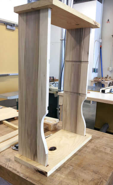 Las piezas 2 laterales fueron cortadas en la Sierra de mesa primero, luego con una sierra de banda para cortar la parte curva. La barbilla se cortaron en la mesa de fresadora, así.