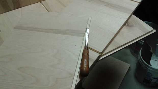 Tiempo de algunas carpinterías. Vamos a usar la barbilla juntas para mantener la caja con una ranura ranuras para nuestras estanterias. La clave para los cortes de mortajas es asegurar que tienes presión hacia abajo sobre la madera contrachapada alrededor de la hoja que corte perfectamente medio camino a través de si hay una leve elevación del panel.