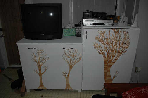 aquí es una manera de hacer una pantalla animada de Halloween, usando sobre todo cosas que ya tienen alrededor de la casa. Funciona la pantalla con un pequeño motor eléctrico conectado a la rueda trasera de mi bicicleta, y ataduras a los pedales tir