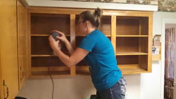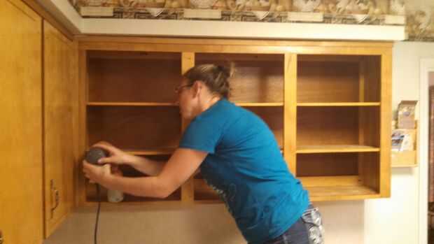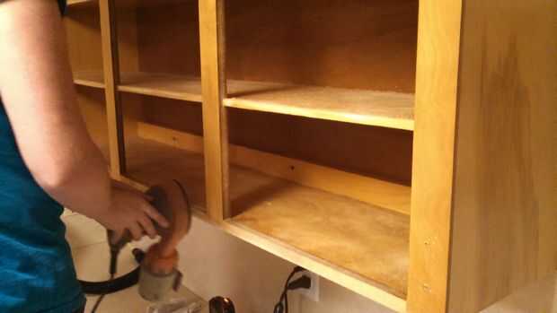 Algunas de mis puertas de armarios y cajón caras tenían un poco de daño del agua y requieren un lijado para eliminar el pandeo. Conseguí sacar mi lijadora eléctrica para hacer el proceso más rápido y fácil. El resto no requieren lijado según las instrucciones de las pinturas.