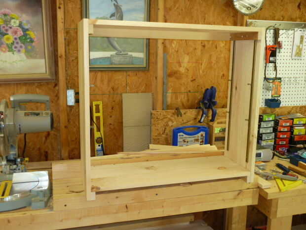 Tornillo de cada pared lateral con el 1 "x 2" piezas, que se convertirá en las calas mantiene todo juntos. Utilice tornillos de 4-1 1/4 en cada Cala. la Cala del fondo será incluso con la parte inferior de la cara y la otra cuña 3/4" hacia abajo desde el borde superior de la Junta. Las calas son demasiado corto de 3/4", esto es para acomodar los tacos de pared en la parte posterior del gabinete.