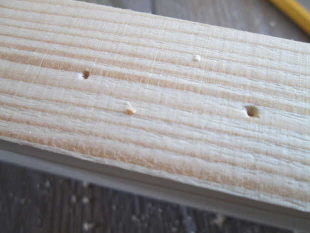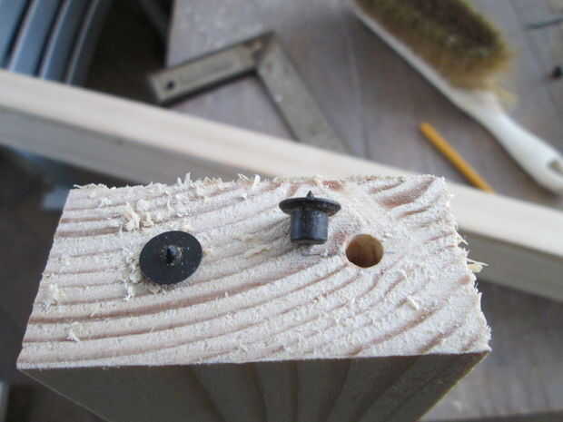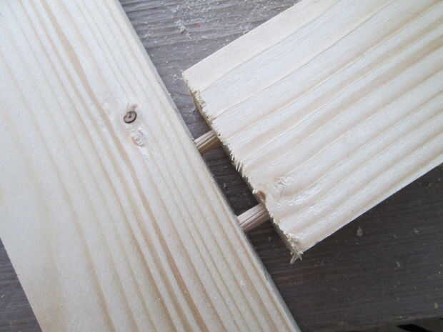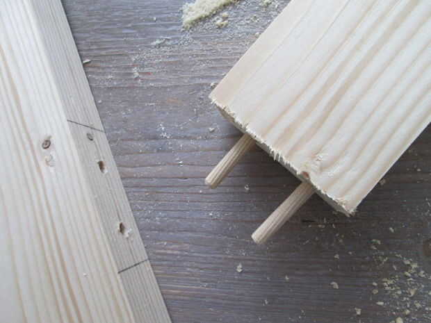 No sé si "pasador guía" es la expresión correcta, pero la imagen muestra lo que quiero decir. Taladre orificios en el extremo de la viga donde desea utilizar tacos, del mismo tamaño que los tacos. Poner en los puntos de guía. Junte los haces sobre una superficie plana. Las abolladuras muestran donde deben taladrarse los agujeros en la otra pieza de madera. Es esencial hacer exactamente vertical. Agregue pegamento de madera y colocar las clavijas en su lugar. Presione firmemente juntos. Si es posible Utilice abrazaderas para sujetar.