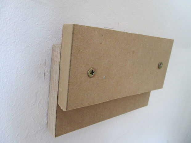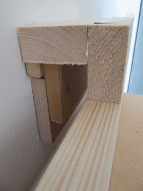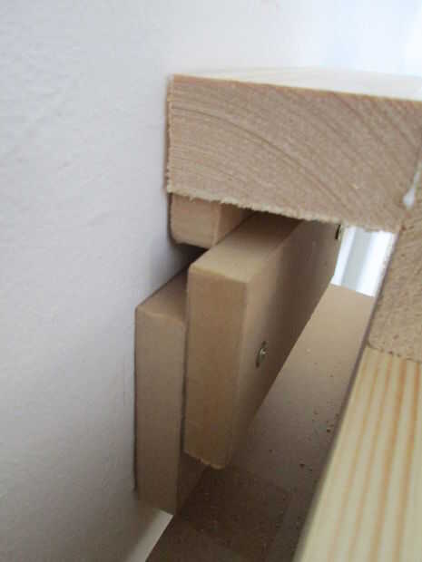 Evitar que el armario caiga hacia adelante. Hice de un gancho en la parte superior del marco con la izquierda sobre la pieza de la viga y un pedacito de listón. El gancho es pegado y atornillado al chasis. Con dos piezas de la izquierda sobre MDF hice una bruja de canto de pared sostiene el gancho del armario. Cuando quiero quitar el armario simplemente puedo levantarlo del gancho