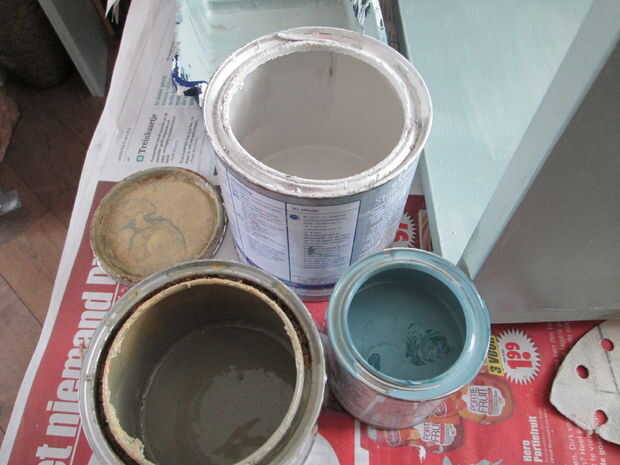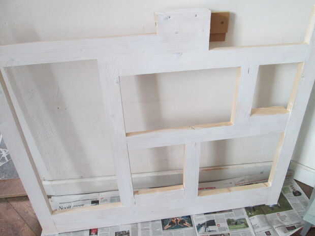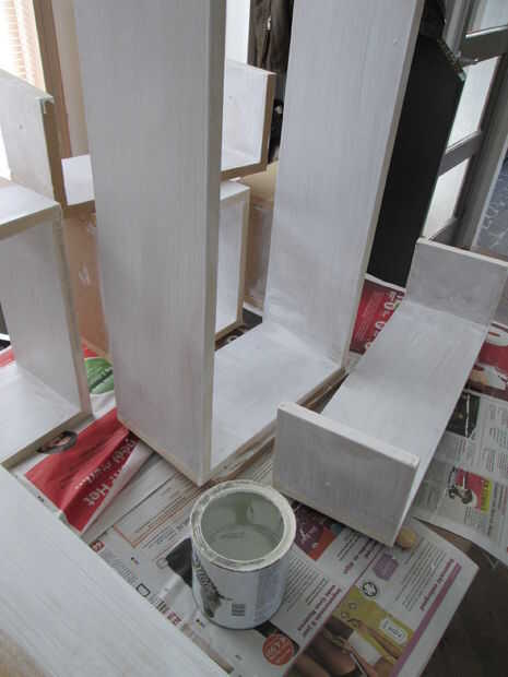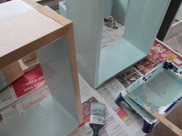 Dan todas las piezas (marco y cajas) una capa de base blanca. Tenga especial cuidado por los bordes del MDF como que empapará toda la primera vez la pintura. Usted tendrá que lijar los bordes después de la pintura. La segunda capa de la estructura debe ser con la misma pintura de pared como el se unirá a la pared. Pinté las cajas en una bruja gris azul verdoso que mezcla de tres colores diferentes. Blanco guijarro, azul acero claro y un verde del ejército. Supongo que usted podría comprar este listo mezclado, pero siempre he dejado sobre pintura, que me gusta usar antes de comprar nuevo. Además me gusta que la pintura no se mezcla completamente y a veces le da un brillo más fuerte del azul o verde.