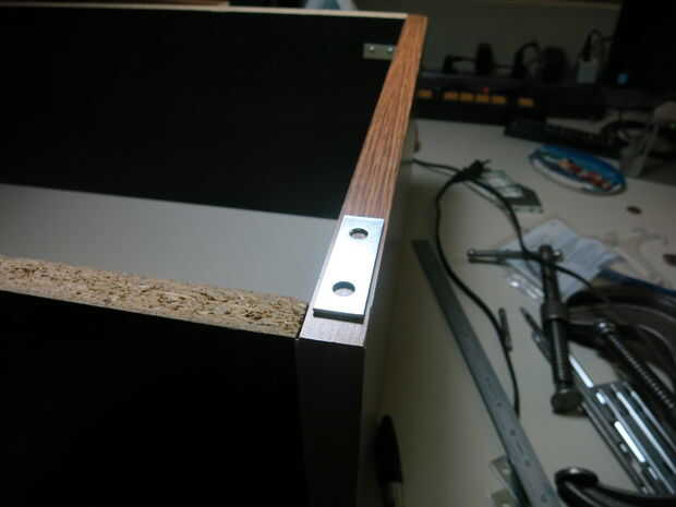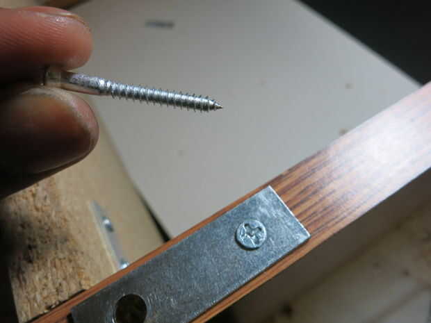 Medir las placas de reparación y la marca de los cuatro puntos donde se va montar. Averiguar donde los agujeros de montaje en pared serán y taladros más grandes en esos lugares. Ahora, poner las placas de reparación en el lugar y tornillo dentro del gabinete con tornillos largos.