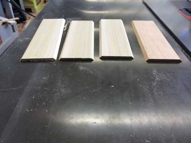 Tomando todas las cuatro piezas en la Sierra de mesa, corte a inglete 45 grados en cada borde mientras que la mínima cantidad de material de corte.