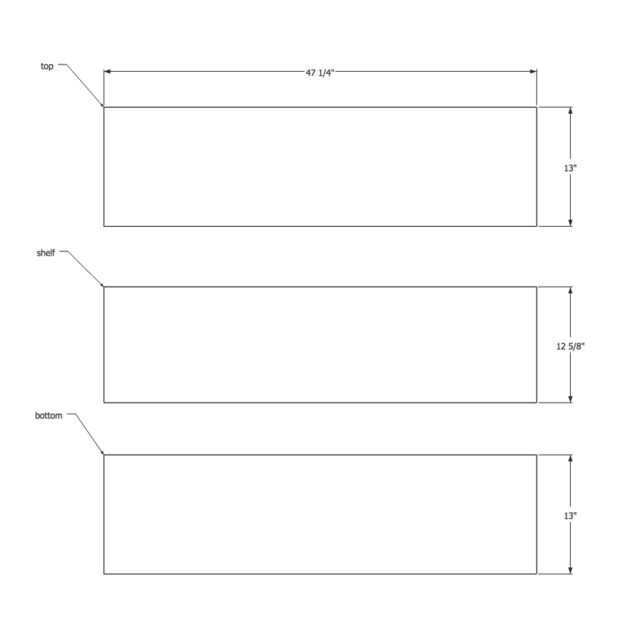 Véase el cuadro 7. Hacer tres estantes simples. Madera sólida o madera contrachapada son aceptables. En el diagrama, se puede ver que el estante del medio es menor que la parte superior e inferior de 3/8". Esto es para acomodar el panel posterior. Si no vas a tener un panel posterior, hacer todos los estantes el completo 13" profundidad.