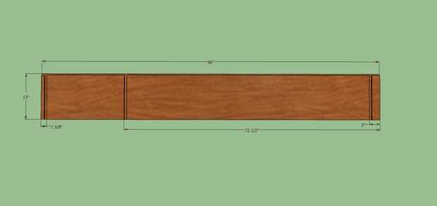 8' largo, 13" de ancho. Madera contrachapada o sólido. Si utilizas sólido, podría tener dificultades para encontrar madera todo el 13". Terminé uniendo dos piezas más estrechas. Hacer uno o dos, dependiendo de si el gabinete estarán en la esquina con el lado contra una pared o independiente, en cuyo caso usted tendrá que hacer dos.