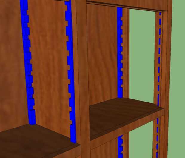 Cortar ocho carriles 1 "x ¾", 68¾ largo para los compartimientos más bajos y ocho carriles 21¾" largo para los compartimientos superiores. Corte muescas como se muestra en las fotos.