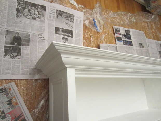 Tomar los trozos de moldura, Aplique pegamento en las uniones y clave la articulación. Mientras que todavía están secando pero clavado, aplicar al frente de la estantería con pegamento y clavos en su lugar. Debería verse como la imagen de abajo.