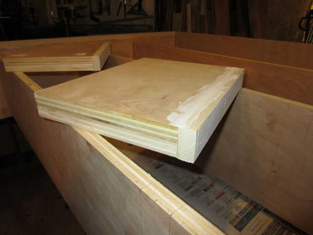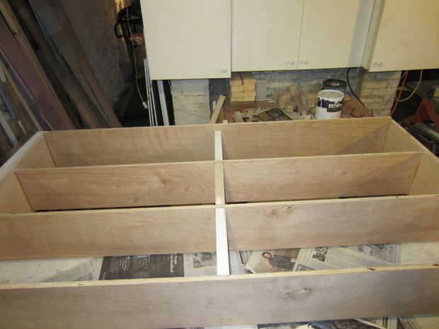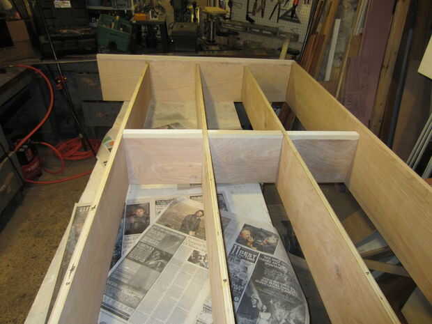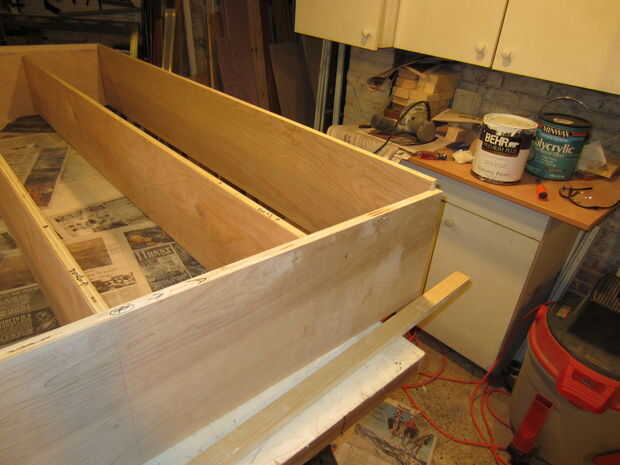 Después de que ha hecho los cortes, es tiempo de montar, cola y clavo. Comience con los estantes. Juntar piezas A, B, H.