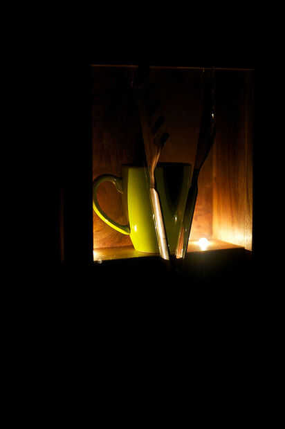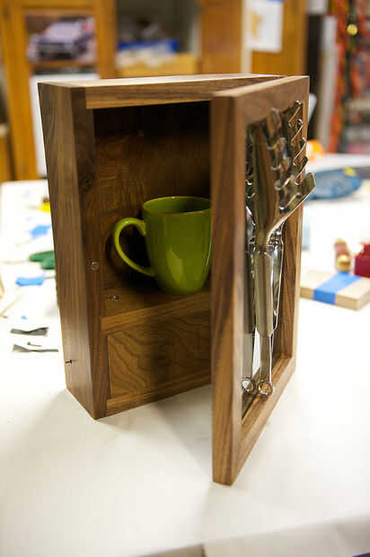 Como dije, mi armario está basado en la escultura, pero también tiene otros aspectos interesantes. Mina está montado en la pared tiene una puerta y un estante interior y ha incorporado electrónica que controla el espejo unidireccional. La idea es: pones un objeto en el cuadro que simboliza su identidad y un objeto en la 'pinza' (mina son pinzas de ensalada realmente) que simboliza lo que otras personas nos vemos como. Cuando el nivel de luz es alto en el ambiente (como, el cuarto que está en el gabinete), el cristal actúa como un espejo. Sin embargo, cuando usted bajar las luces en la habitación, el sensor de luz en el gabinete desencadena un MOSFET que enciende luces pequeñas dentro de la caja, girar el espejo en vidrio transparente y lo que le permite ver el objeto dentro del gabinete.