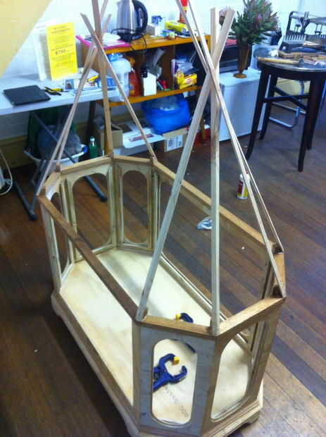 Gabinete de exhibición de muñecas Monsterhigh en la forma de un ataúd.Esto fue fácil de hacer.Me sacó 4 lats de plataforma y córtelos a la longitud deseada con el conjunto de la sierra a 15 grados. Pegado, había clavado y todas las uniones atornillad