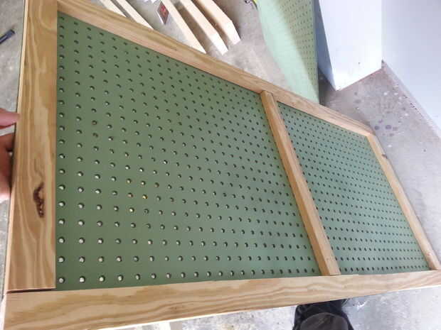 Este respaldo es principalmente estructural y dar un espacio entre la pegboard y la pared para que las clavijas tienen espacio para ir. En esta etapa he intentado utilizar unos tornillos tan posibles como que mucho más se va a través de los tablones y necesita dejar espacio para ellos. Cuando pone en tratar de fregadero empotrado por lo que no causa problemas en la siguiente capa de la madera. Empecé con tablas de 1 x 4 que miden realmente hacia fuera a cerca de 3/4 x 3 1/2 pulgadas. Corte con la sierra circular a las longitudes necesarias para ir alrededor del borde de la Junta de peg. 1 tablón de 48 pulgadas y 2 de 20 1/2 pulgadas. Una vez tuve que hacer acabo de encontrar el centro de cada tablero y dibujó una línea con un borde recto para guiar mi corte y dividir cada tablero en medio. Guardar la Junta extra como la usaremos más adelante. Luego utiliza 2 tornillos por tabla y pegado a los tornillos #10-1 para salir de la espalda. Se me olvidó tomar fotos así que hacen un poco mental planificación previa en la ubicación de los tornillos y usted debe ser fino.