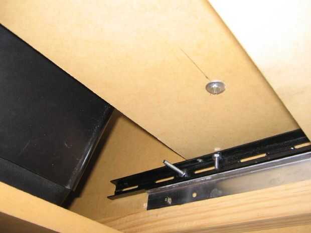 He intentado construir una base sólida con un 18mm MDF pero podría usarse cualquier otro tipo de madera. Coloqué este apoyo sobre el marco de fijación con dos guías metálicas en cada extremo. (luego fijo a las guías a los lados del gabinete con tornillos).