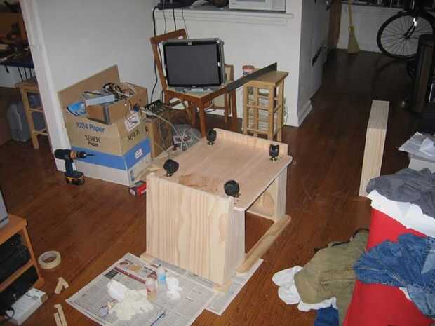 Para montar el CRT en el gabinete del monitor, apiladas 2 piezas triangulo en cada esquina y recortada para colocar la pantalla lo más cerca posible de la superficie de la mesa. Ajustaron cada par de triángulo con el grano corriendo en direcciones opuestas antes de cortar el espesor correcto. Después de que los triángulos están instalados en el gabinete del monitor, tienes al menos 2 pulgadas de madera para enroscar en montar el CRT.