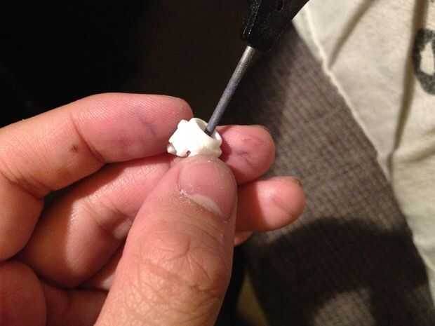 • Los botones separados del clip, utilice una lima para eliminar el barniz transparente desde el interior, utilizar una selección de diente y asegúrese de que el interior los bordes están limpios de polvo suelto de nylon. arena alrededor del botón para asegurarse de que no bloquee en el interior.