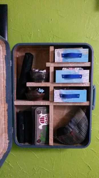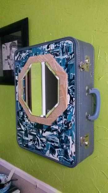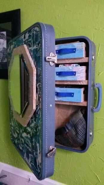 Encontré esta vieja maleta en una tienda de antigüedades local y decidió que debe ser la más reciente adición a mis paredes. Tengo un "espacio de descarga" junto a la puerta donde poner todos los artículos llevo conmigo todos los días. Lamentablemente también está lleno de cosas que uso de vez en cuando, pero no lo suficiente para desorden el espacio. Esta maleta tiene ahora elementos como mi paraguas (listo para un día lluvioso), gafas de sol extras (para cuando desaparecen los habituales) y cupones para más suministros de construcción. Incluso puedo comprobar mi maquillaje antes de salir de la casa para el día.