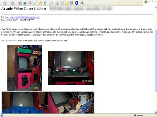 De todos modos. Encontrado mi gabinete de Craigslist, ver adjunto captura de pantalla del anuncio original (también puedes probar eBayo tu local Video Arcade); fue vendido como "trabajando" pero viene sin ningún tablero de juego. Además, no fue un gabinete dedicado raro, sino más bien como un gabinete genérico sin ninguna importancia "histórica". Eso es exactamente lo que buscaba para mi proyecto y lo compré por poco más de $ 100.