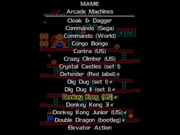 Desde aquí puedo seleccionar el juego que quiero jugar de una lista, utilizando los palillos y los botones. Seleccionar un juego, que luego es lanzado con MAME para Dos y luego puede jugar con él. He adjuntado una imagen animada que simula lo que sucede cuando arranco mi maquina.