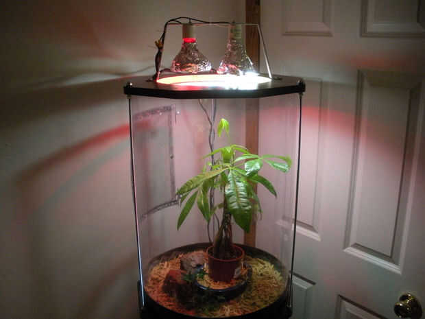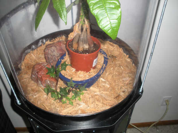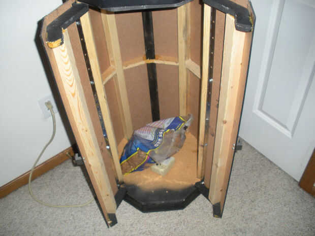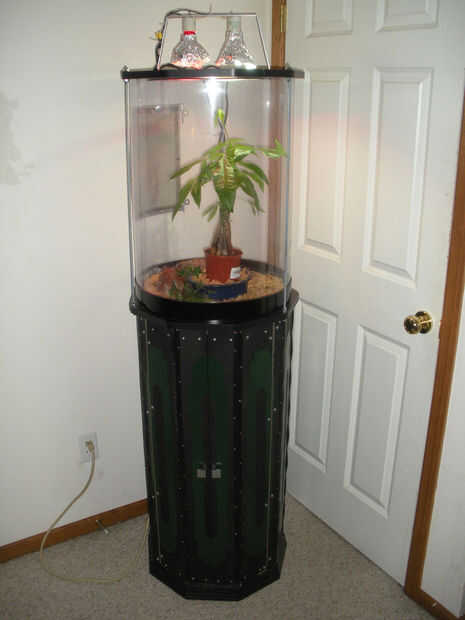 Los 2 pedazos más grandes fueron utilizados como la parte superior e inferior del hábitat, con el anillo de enrutado con hoja de plástico transparente con una puerta en ella. Tres varillas roscadas apoyan la parte superior. La pieza más pequeña fue duplicada y fueron usados como la parte superior e inferior del gabinete. El gabinete está hecho de 2 x 2 y 1/4" tablero duro.