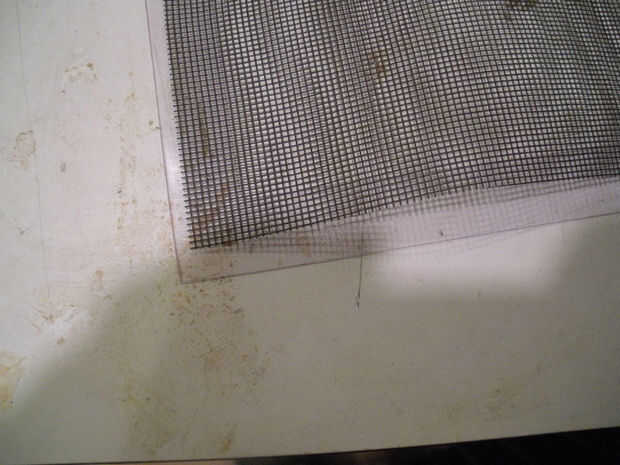 -Corte la pantalla de la ventana para traslape 1/2 camino a través del marco todo el camino alrededor, posición en uno de los marcos de plástico.