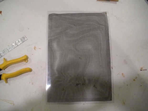 -La puerta se hace de la misma película de plástico transparente, imanes de neodimio y pantalla de la ventana de nylon estándar. Calculado para hacer la puerta 9 "x 12", espacio suficiente para tener en mis manos dentro de la carcasa para limpiar o lo que no.
