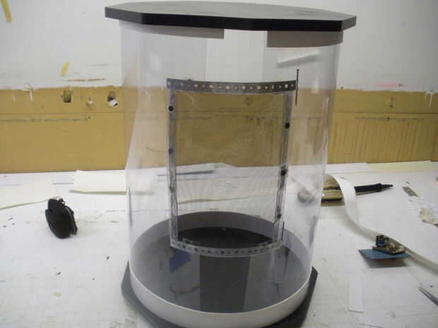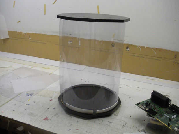 -Para probar cómo funcionaría se deslizó la chapa en el anillo de enrutado en uno de los extremos de nonagon y encuentra la hoja con la otra. Utilizar alguna cinta para sostenerla, por lo que forman un cilindro. La hoja era un poco a pequeño, pero fácilmente fue parcheado.