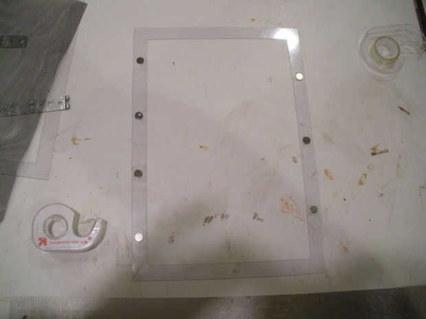 -Utilizar el otro rectángulo de plástico y sandwich los magents, pantalla y fleje de metal entre ellas.