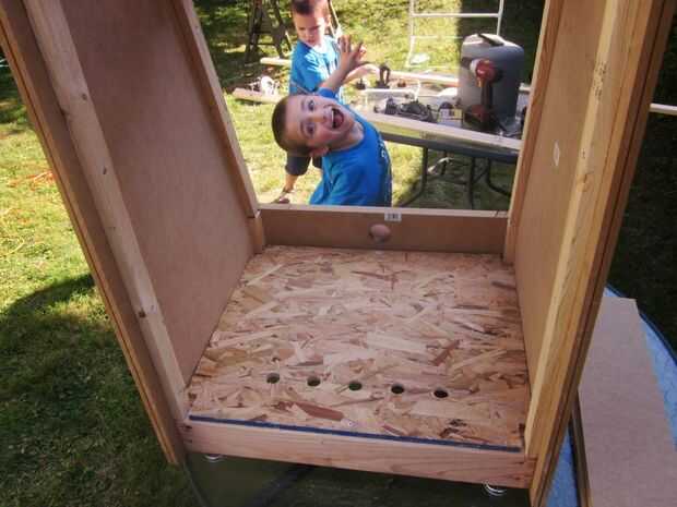 Corté mi panel inferior de algún retal OSB que tenía por ahí. Si lo tuviera que hacer otra vez, utilizo MDF. corte para que quepa dentro de la parte inferior del gabinete y había atornillada a la base de 2 x 4. Usé una broca para perforar algunos agujeros de ventilación en la parte inferior de 1" espada.