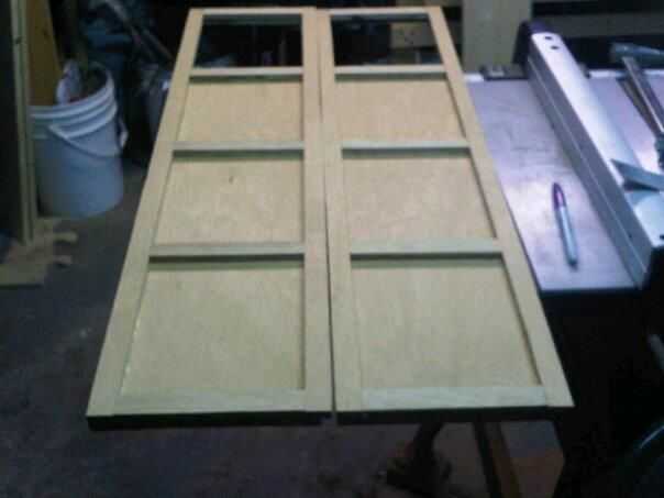 soy TARDIS obsesionado, por lo que quería hacer mi propia maquina del tiempo. Lamentablemente, no puedo encontrar un instructivo sobre cómo hacer más grande en el interior todavía. Realmente no sigo un patrón que tenía un escritorio, un montón de madera de desecho, y algunos tiempo libre. Este proyecto fue el primero en que la mayoría de los componentes estaban pegada en el. La mayoría de mis compilaciones al azar ha puesto tornillos y hardware. Esto fue un reto tratar de averiguar cómo hacer las cosas para quedarse mientras el pegamento seca. Lo primero que debe hacer frente eran las puertas distintivas. Empecé con varias hojas de 2 X 4 de madera contrachapada que consegui por un dólar en la restauración local. Arrancó un manojo de tiras de 1 pulgada y utiliza pegamento para madera para unir la a los paneles de puerta.