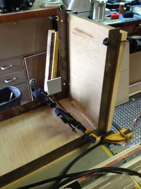 Con la parte delantera y traseras pedazos (el. 75" tiras) de estructura montado en las piezas de superior/inferior/lateral, tienes un lugar conveniente para atar sus pinzas y plazas durante el montaje. Reuní una esquina a la vez, añadiendo una pieza de refuerzo en cada esquina (siendo consciente de los requisitos de instalación de la placa deflectora), pegar y todo lo que entra en contacto con otra pieza de madera atornillar y permitir que seque durante la noche antes de pasar a la siguiente esquina.