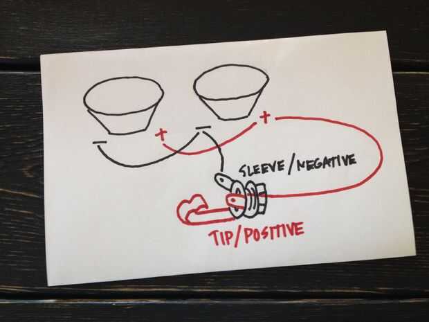 Quería que el gabinete a 8 ohms por lo que opté por altavoces de 2-16 ohmios y cableados en paralelo. Que, como se muestra en otro de mis arañazos, es positivo de un altavoz -> altavoz B positivo -> punta / positivo en la clavija. Entonces básicamente lo mismo con los negativos pero a la manga / negativo en el conector.