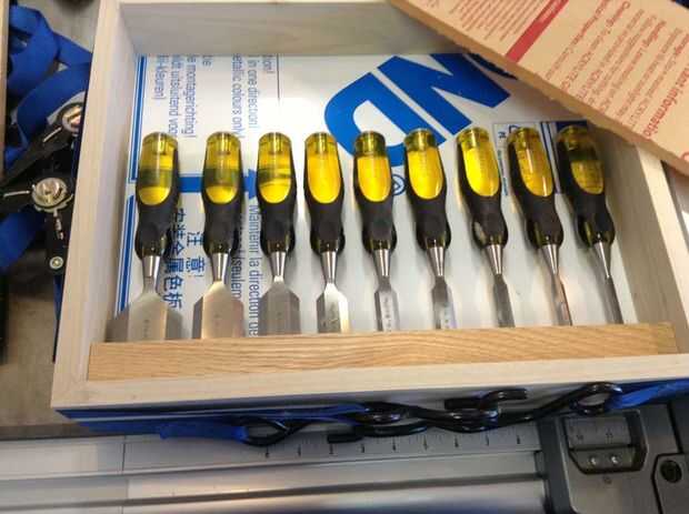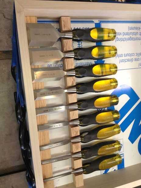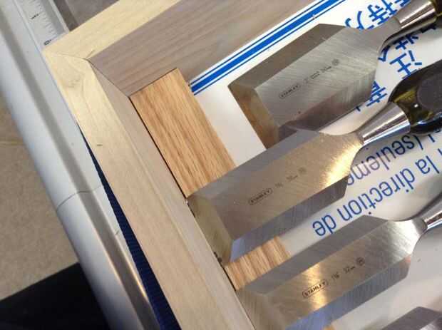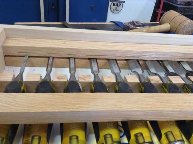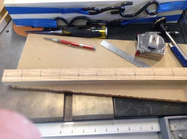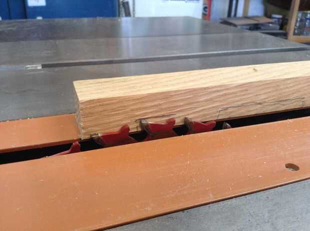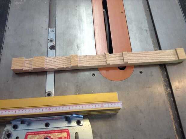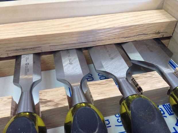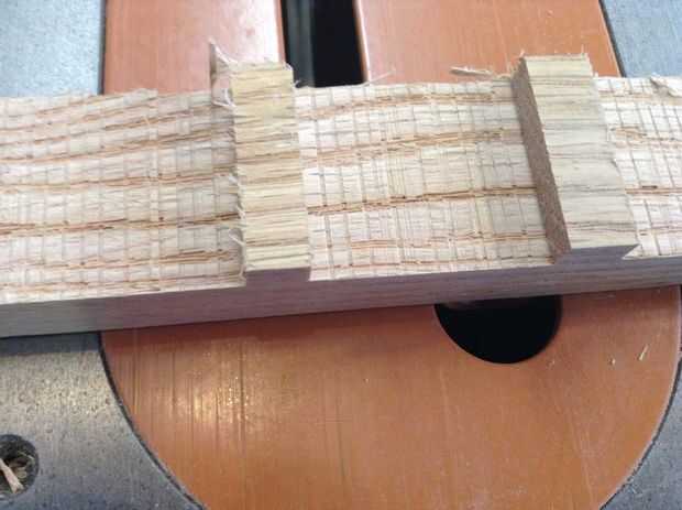 A partir de la baranda inferior, coloqué los cinceles en la parte superior un 1/2" espesor pieza de roble de 1". Esto ayudó a mantener los cinceles en un plano posición con ningún bamboleo de reposo. A continuación, coloca un 3/4" ancho 1/2" espesor listón encima de la hoja de cincel en la parte inferior de la cabina y había marcado dónde sería la ubicación de las hojas. Luego usé mi sierra de mesa para comer lejos de 3/16 Avos del espesor lejos para permitir que las cuchillas del cincel se deslice bajo. Entonces pegué bajo las hojas de cincel en la parte inferior del riel. Ahora pega el travesaño en el lugar y deje que se seque.