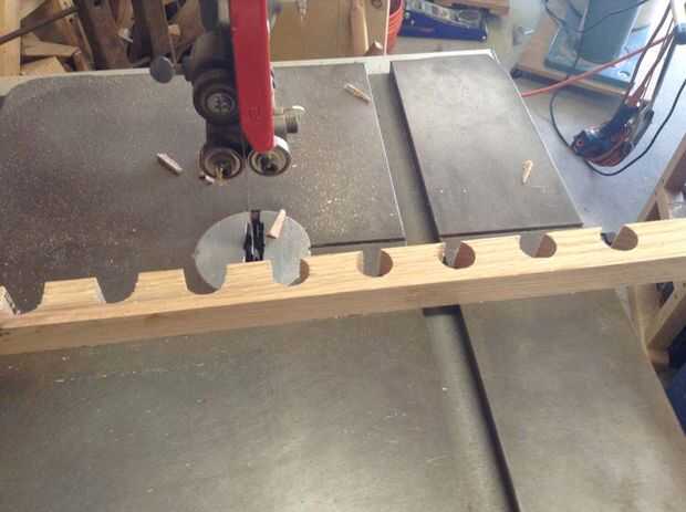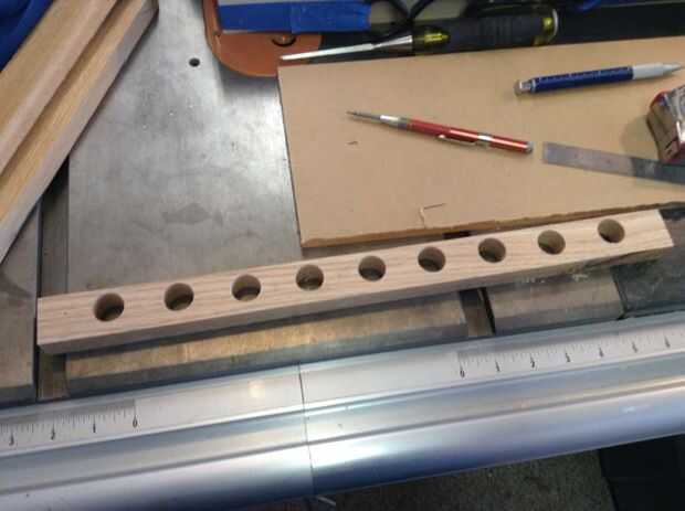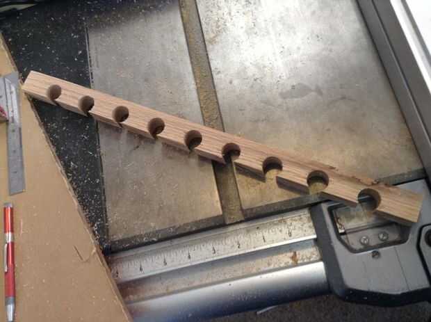 He medido el diámetro de los cinceles y encontró un poco de forsnter del mismo diámetro. Luego mide y marca los agujeros por todos los cinceles y usando el taladro perforé los. A continuación, necesito cortar una porción de este carril para abrir los agujeros. Simplemente utiliza la Sierra de mesa y había Ripeado dejando sobre 2/3rds del agujero. Entonces usando la sierra I limpiar los agujeros y les arena. Nota: Repita este proceso para la manija de puerta horquilla.