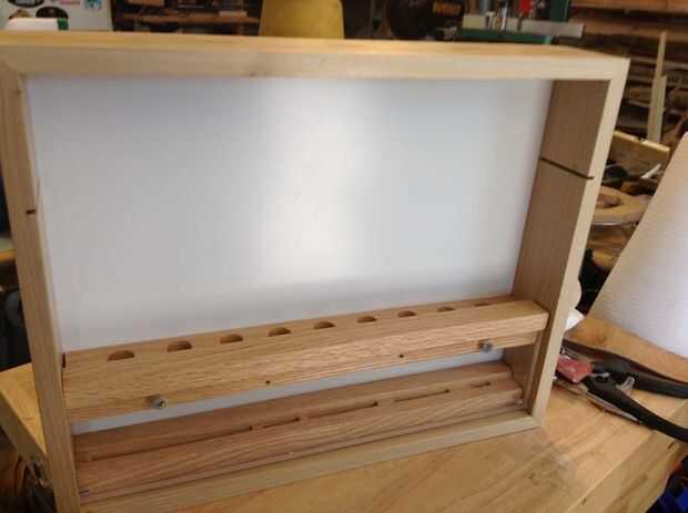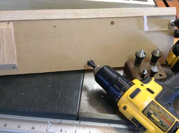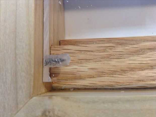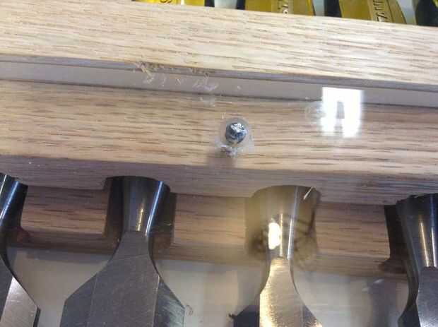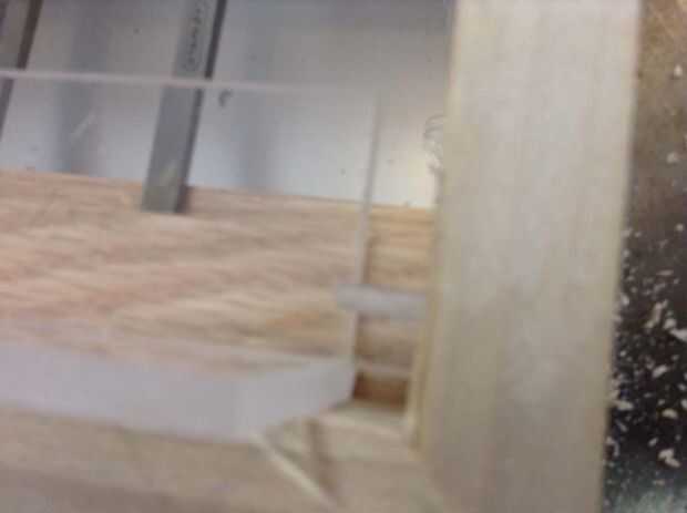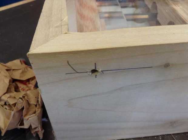 Después se monta la puerta Asegúrese de que todos los cinceles están en su lugar y coloque la puerta en su lugar. En la parte inferior y en las esquinas inferiores puse 1/4" espesor separadores y ligeramente juntos para que sea sujeta de la bisagra. La puerta se abre hacia abajo por lo que en las dos esquinas inferiores del lado taladré un agujero piloto para un tornillo de apriete firmemente en el. No conducir el tornillo completamente en solo voy lo suficientemente profunda como para marcar el plexiglás. Luego, utilizando un poco más grande, taladro en las partes de plexiglás sobre 1/4" o profundamente bastante para aceptar toda la longitud del tornillo que sobresale del punto de bisagra.