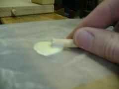 -Una vez que esté listo para fijar los tacos, rodarlos en pegamento en papel encerado y poner en su lugar, también capa de superficie a unir con pegamento