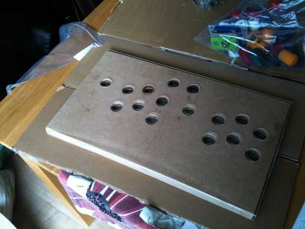 Una vez que tenía un plan, I corte otro pedazo de MDF a medida, marcan las posiciones de los orificios y recorto con la sierra cilíndrica. Obviamente el tamaño del agujero necesario emparejar sus botones y palancas de mando.