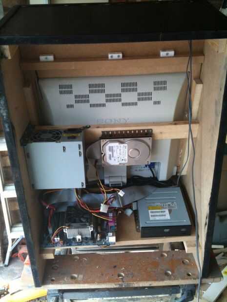 Una vez que el gabinete está construido y el monitor instalado, las entrañas de la PC de los donantes fueron sacadas y colocadas en la parte posterior. La placa base sólo fue atornillada a la base como el disco duro y fuente de alimentación (dentro de las longitudes de los cables). La unidad de disco que se muestra fue utilizada durante la etapa de instalación de software y fue quitada luego.