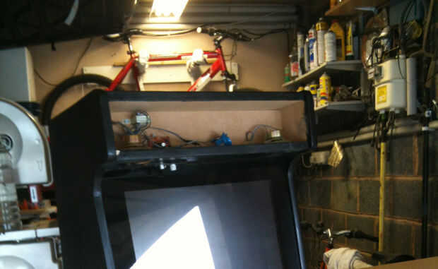 El sistema de sonido era un barato sistema de altavoces PC accionado que fue desmontado y las piezas agregadas al cuadro de marquesina. Si te fijas bien en la foto que se puede ver los dos altavoces punto hacia abajo hacia la pantalla (los agujeros son necesarios) y el pequeño transformador, controles de potencia interruptor y volumen. Estos fueron instalados en la cara inferior de la caja de modo que eran accesibles por el usuario pero ocultos. Una vez más, el sistema obtiene su energía de una la fuente de alimentación de PC.