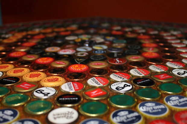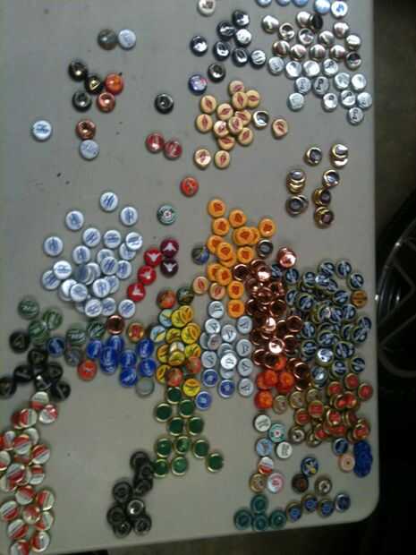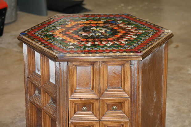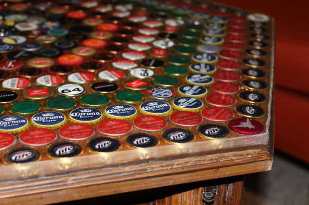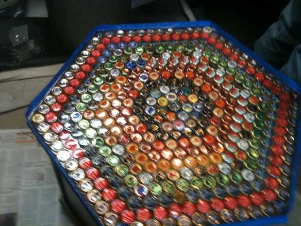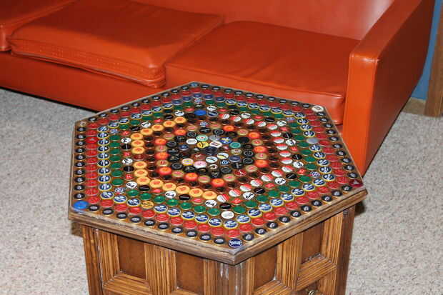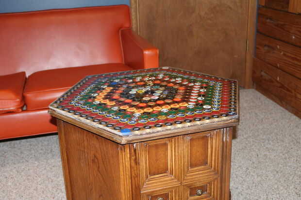 este es un proyecto que quería hacer durante mucho tiempo!  Tengo un amigo que es amigo de un camarero que me enganchó para arriba con una gran cantidad de la botella muestras los casquillos.  Esta sería la mejor ruta para ir a alguien que no quiere beber muchas bebidas.  Sin embargo me aseguré que incluí el grano correa mayúsculas que vino de una noche inolvidable.  Algunas de las tapas de botella vinieron de artesanales y cervezas locales que pueden ser más interesantes en diseño.  La mesa de gabinete compró al ejército de salvación para unos 12 dólares.  La forma hexagonal es estéticamente atractiva por lo que se busque algo diferente.  Este proyecto fue la primera vez nunca he utilizado ningún alto brillo acabado y tuve algunos problemas.